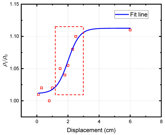 Relationship between the soil displacement and the density ratio , where ρ0 and ρ1 were the initial and final densities after the DC tests on the modeled sandy ground.