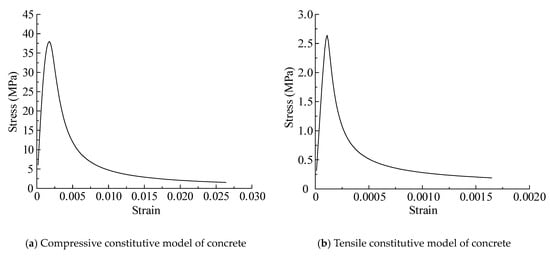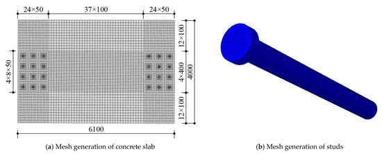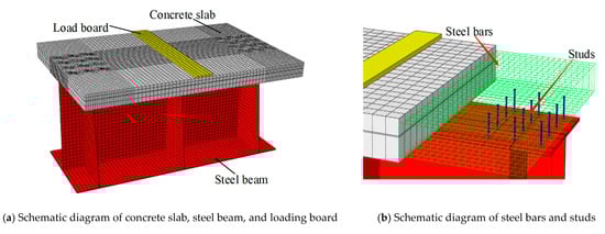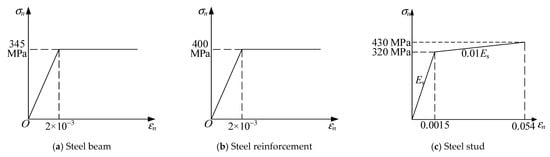 15], with the elements adopting a force–displacement macroscopic constitutive model instead of the stress–strain microscopic constitutive model; and (4) the simulation of the studs by setting the face-to-face contact relationship [