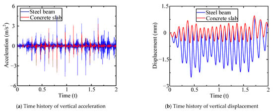 (1) For the vibration characteristics of the area without a stud constraint at the composite beam interface, there is a certain phase difference between the acceleration time curve of the concrete slab and the steel beam at the local peak of the acceleration time curve of each specimen. The displacement time curve of each specimen is basically cyclic, and the trend is that the concrete slab and the steel beam are separated at the peak of the negative displacement of the concrete slab and return to the fit state after reaching the peak of their respective positive and negative displacements.