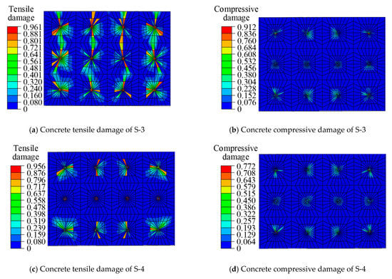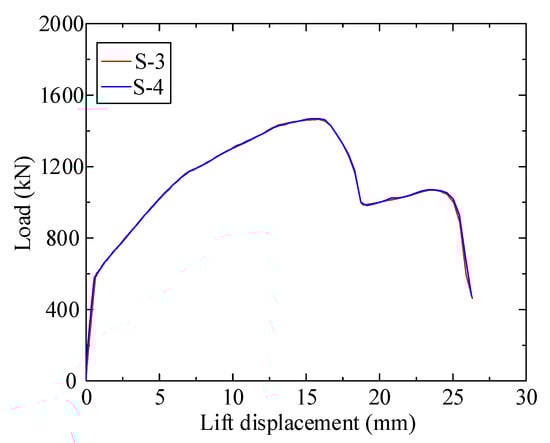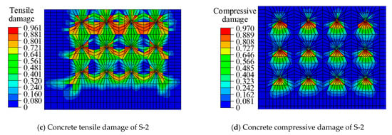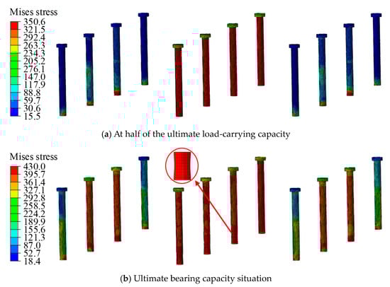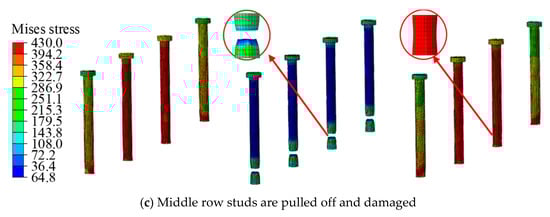 (2) For the finite element simulation of the group stud local specimen launch, the ultimate load capacity of the existing damaged launch specimen decreased by 24.8%; the ultimate slip decreased by 15%; and the shear stiffness decreased by 12.8% compared with the force performance index of the undamaged launch specimen. In the process of conducting the finite element simulation of the group stud specimen pull-out, the studs in the middle row had higher stress and were the first to fracture, and the tensile force was redistributed among the rest of the studs, which led to an obvious step in the decreasing section of the load capacity. Compared with the stress performance indices of the undamaged extracted specimens, the ultimate load capacity of the existing damaged extracted specimens decreased by 0.2%; the lift displacement when the middle row of studs was pulled off decreased by 2.1%; the lift displacement when all the studs were pulled off decreased by 1.6%; and the pull-out stiffness decreased by 0.55%. Vibration damage had a greater effect on the shear performance of the studs and had little effect on the pull-out resistance of the studs.