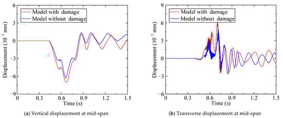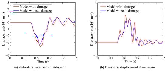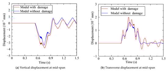 (3) For the single-train travel and the two-train rendezvous, the peak vertical and lateral displacements of the existing damaged composite girder bridge increased by different degrees for different passing speeds compared to the undamaged composite girder. In the case of the single-train travel, the spanwise vertical displacements of the existing damaged composite beam increased by 13%, 8.38%, and 6.2% for the passing speeds of 360 km/h, 330 km/h, and 300 km/h, respectively, and the lateral displacements increased by 24.2%, 15%, and 9.2%, respectively, compared with the undamaged composite beam. In the case of the two-train rendezvous, the vertical displacements in the span increased by 8.8%, 13.7%, and 12.8%, respectively, and the lateral displacements increased by 26.4%, 53%, and 24.8%, respectively. In general, the degradation of the shear connection force performance during single-train travel has the greatest effect on the response of the combined girder for the 360 km/h passing speed; in the case of the two-train rendezvous, the degradation of the shear connection force performance has the greatest effect on the response of the combined girder bridge for the 330 km/h passing speed.