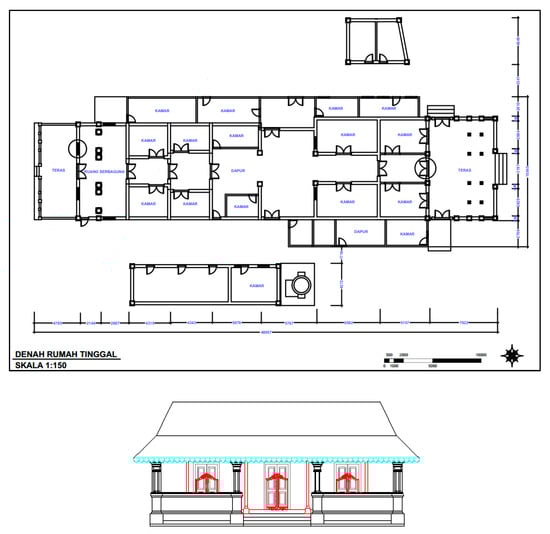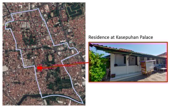 The heritage building used as a case study in this research was a building that currently functions as a residence. The building is in a dense residential area of Kasepuhan Palace, as seen in Figure 1. Kasepuhan Palace is located in Cirebon City, West Java, Indonesia. Kasepuhan Palace, referred to as Keraton Kasepuhan, was established in 1529 and is a cultural heritage center with an important role in history. Keraton Kasepuhan still exists similarly to other palaces in Indonesia. The settlements around the Keraton Kasepuhan were initially formed for families and courtiers []. The building that was the case study in the Keraton Kasepuhan area is a residence belonging to the family of Pangeran Arya Denda, one of the princes. This building is estimated to have been built in 1898 in the village of Mandalangen. According to Said (2004), traditional houses were built in the same way by previous residents without any changes; so, traditional houses were formed based on the traditions that existed in the community. Traditional homes are also referred to as traditional houses, original houses, or people’s houses [].
