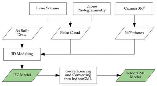 The building model in this paper was stored as IFC and IndoorGML models. The IFC model still uses local coordinates; so, it was necessary to georeference it before converting it to an IndoorGML data structure. An IndoorGML model was needed to perform spatial analysis indoors, which cannot be performed using the IFC model. The flow diagram for 3D modeling, starting from data acquisition, can be seen in Figure 3. The 3D modeling used ArchiCAD (Graphisoft) software, and both georeferencing and converting the model from IFC to CityGML used FME Workbench from Safe Software.