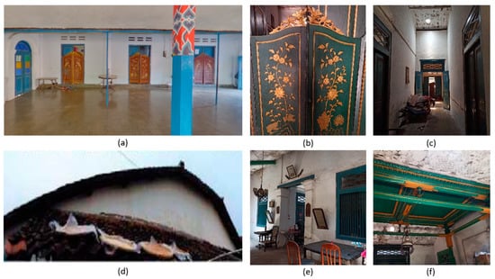 Building exterior and interior of Rumah Pangeran Arya Denda: (a) wooden column; (b) green painted door; (c) high roof and traditional doors; (d) traditional roof; (e) windows, large columns, and home decoration; (f) roof’s ornament and lamp.