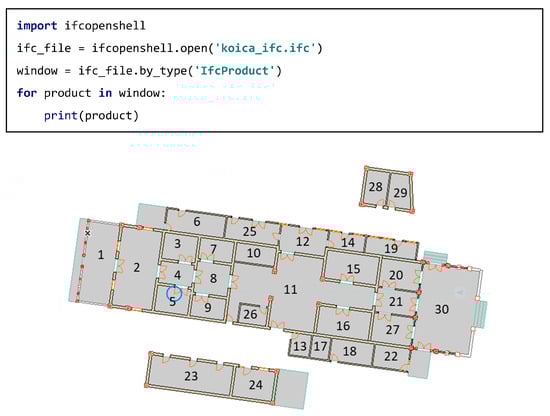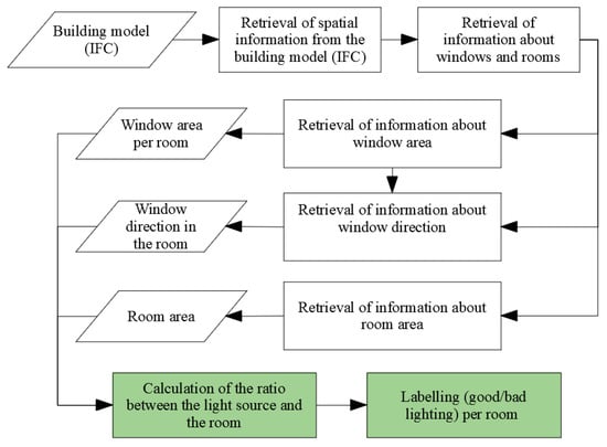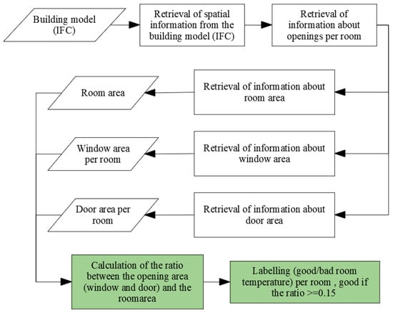 Based on the 3D building model, the information of openings was taken and used for comparison with the room area. The information about the room was taken from IfcSpace, the window from IfcWindow, and the door from IfcDoor. Rooms’ area and windows’ area information was taken from IFC properties using IfcOpenShell, an open-source software library for working with the IFC file format from https://github.com/IfcOpenShell/IfcOpenShell (accessed 10 December 2021).