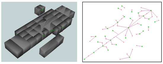 The IFC model only uses the local coordinates. Therefore, it must use georeferencing to make it sync with the GIS model; in this research, it was IndoorGML. Based on the diagram in Figure 3, georeferencing was carried out on the IFC model to have real coordinates. After the georeferencing process was complete, the conversion was carried out using the FME Workbench with the flow, as in [], which was improved and adjusted to the needs. The IndoorGML model can be built into primal space and dual space models. Visualization of the IndoorGML’s real space model can be seen in Figure 10. The dual space model was used to perform spatial analysis in the room, which will be formed into a graph, represented as nodes and lines. The green nodes represent the centroid of each room, and the red nodes represent the doors. The graph can be used to perform network analysis that will be described in the indoor spatial analysis part of this research.