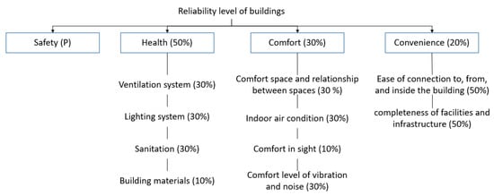 All results of the previous analysis were then used as input to calculate the reliability value of the building using the analytic hierarchy process (AHP) method []. There was a consensus from Puslitbang Permukiman (Settlement Research and Development Center) in 2011 that writes a building reliability assessment scheme by considering four reliability criteria, namely, safety, health, comfort, and convenience. The weight percentage of each analysis can be seen in Figure 12. The percentage of safety criteria is not stated and only gives the description P, which means that these criteria are prerequisites that are considered reliable so that further evaluation of the reliability of the building can be carried out.