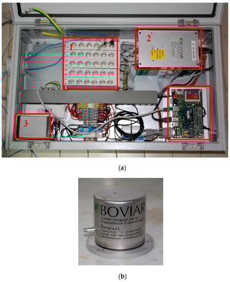 Figure 1. (a) Data acquisition hardware Dymas 24. It is composed of 30 channels (1) managed by 5 acquisition cards (2), an internal battery, (3) and a central unit with CPU that has the task of managing the acquisition process, synchronization of the sensors, and data storage (4); (b) PCB 393 C accelerometer. - -