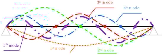 where is a parameter depending on the damping ratio, considering eigenfrequency, excitation spectra, and modal participation factor, see [33,34]. is the mode shape vector corresponding to frequency . In this paper, the beam eigenfrequencies were identified from the resonant peak in the autospectral density using the PP approach. The method was quite efficient since the considered eigenmodes were well-detached, as is typical for simple structures such as beams. In case of eigenmodes close to each other, it is possible to filter the accelerometric data in order to improve the accuracy or to use different approaches such as FDD [7], TDD [8], or SSI [9].
