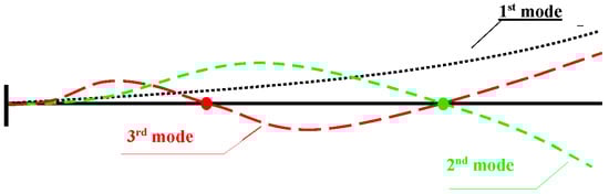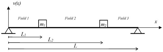 Given the mass of the accelerometer (0.89 kg), of the vibrodyne (0.93 kg), and of the beam (8.82 kg), it is necessary to take into account the exact position of these masses also in the analytical model. For this reason, the Euler–Bernoulli beam Equation (7) has been integrated considering the three different fields separated by the two lumped masses of the vibrodyne and of the accelerometer, see Figure 7.