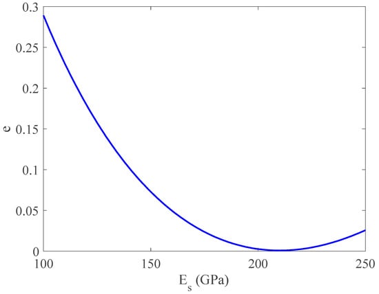 The steps are repeated till a minimum value of error e is obtained. Figure 8 presents the trend of error function e that easily points at the optimal value of Es-opt = 205 GPa. In this way, it was possible to have very little relative error (less than 1%) between the real Es-real = 203 GPa and the ones that minimize the difference in the eigenfrequencies, see Table 4, confirming the accuracy of the developed approach. Thus, when measuring the experimental eigenfrequencies, it is possible to set up an inverse problem that can allow to determine the unknown mechanical characteristics.