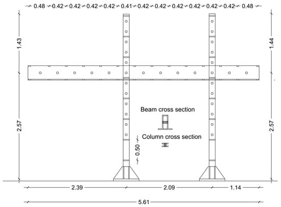 All structural components are made of S275 steel grade, according to UNI EN 10025 [37], except for the pins, which are made of S355 steel grade. Each column is made of two 25 × 200 mm holed plates 40 mm apart, joined by 40 25 × 45 mm welded battens 250 mm apart and has a total height of 4965 mm. Fifteen holes with a diameter of 50 mm along each column allow the crossbar to be placed variably from a minimum height of 1105 mm to a maximum of 4605 mm. The crossbar consists of two L-shaped welded profiles made of two plates: 120 × 25 mm for the vertical leg and 325 × 25 mm for the horizontal one. The two angles are, thus, coupled by means of welded battens 420 mm apart. The beam has a total length of 5910 mm and can be employed at the maximum span of 5040 mm.