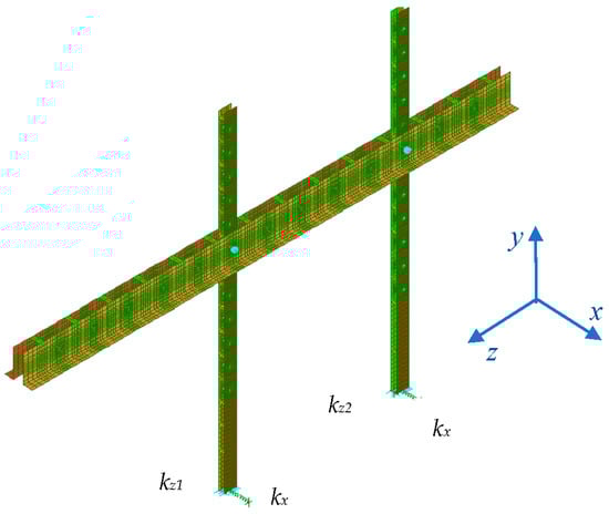 The 3D finite element model was developed using the commercial software Strand7 (see Figure 14). For the modeling of the columns and the crossbeam, 15,948 four-node bilinear isoparametric plate elements were used. Mutual and base connections of steel members were modeled by means of multipoint constraints employing a total of 234 link elements. In detail, the pin connections were modeled as hinged internal constraints involving translational rigid links, while the base column connections were carried out by constraining the base section to a master node where flexural base springs were located. The examination of structural details suggested that no translations were likely to occur at the column bases, thus no translational base springs were taken into account. For the same reason, no torsional springs were accounted for. In both cases, the degrees of freedom were rigidly restrained. The total number of model nodes is 17,702.