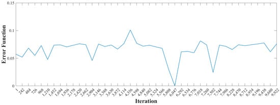 The algorithm performed 10,018 iterations (Figure 15 and Figure 16), identifying at the iteration number 6047 the parameters that minimize the difference between the experimental and model eigenfrequencies, see Equation (3).