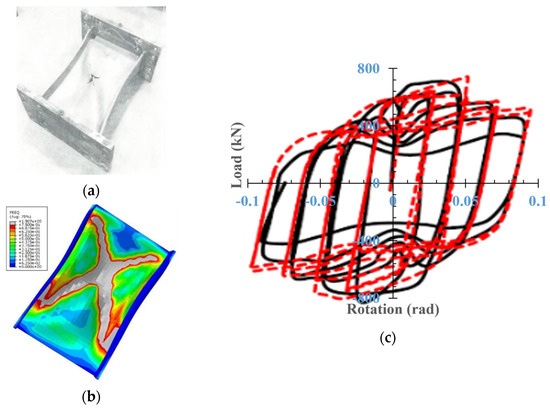 Comparison of results of the FE modeling and the experimental test. (a) The shear link at the end of testing [35]; (b) FE simulation; (c) comparing the hysteresis curves.