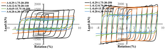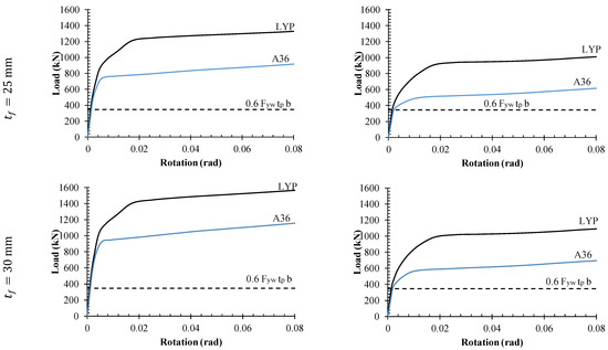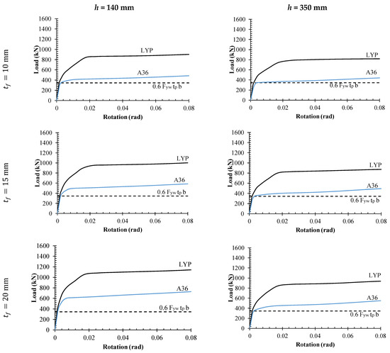 In Figure 7, the load-rotation of FE models with h = 140 mm and h = 350 mm are compared. In summary, other dampers are not shown, but all results are listed in Table 3. Results show that utilizing the LYP steel for the web plate made the curves rise, which caused an increase in the ultimate strength, dissipating energy, and stiffness. Moreover, in the A36 damper with a thinner flange plate, the Vn is close to , mainly in dampers with lower h; however, increasing the tf causes an increase in the difference between the and the ultimate strength of the dampers. This confirmed that the flange plate contributes to carrying the imposed load to the damper. Additionally, the equation predicts the minimum shear strength of the damper for a damper with higher h (and higher ρ). For the damper with lower h, the equation predicts the elastic zone with high error as minimum values of shear strength. Correspondingly, for all LYP dampers, the AISC recommendation predicts minimum values of the shear strength that is lower than the ultimate strength of the dampers.