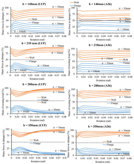 This section evaluates the relative contributions of the flange and the web to the performance of the damper. To do so, the load rotation of dampers for both LYP and A36 dampers with different h is plotted in Figure 9. Results indicate that in the elastic zone, web plates of all dampers are the same contribution. Nevertheless, in the nonlinear zone, for both LYP and A36 damper, the flange plate contributes to the load carrying that is increased by increasing the tf.