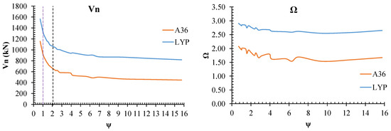 In Figure 11, the maximum increasing of the parameters Vn, Ω, and E due to increasing the tf are plotted versus the h. This figure shows that A36 has more sensitive flange plate properties than LYP. Additionally, the Vn and E have a greater increase, whereas the Ω has a lower sensitivity to the flange plate properties.