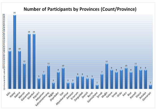 The distribution of the provinces where the respondents reside is presented in Figure 4. The x-axis at the bottom of the graph gives the names of the provinces. The height of the column corresponding to each province name is shown as a numerical value on the left side of the graph. These columns represent the number of respondents in the relevant province.