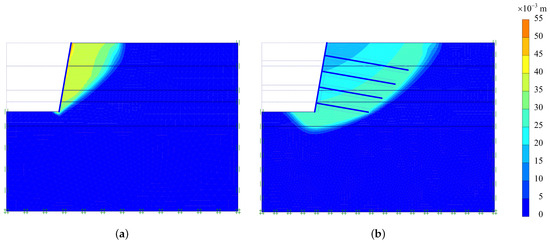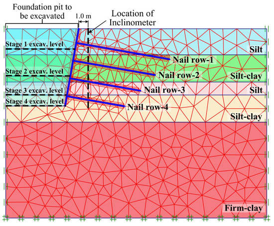 In the following analyses, four rows of soil-nailing, as shown in Figure 1, have been provided. The lengths of the nails have been arranged in such a way that they all pass through the possible sliding surface shown in Figure 2a, which was 8 m, 7 m, 6 m and 5 m, respectively, from top (Nail row–1) to bottom (Nail row–4). With this sort of arrangement, the total required length was 26 m, which is less than the 34 m used in [27]. Even though the consumption of the reinforcement bar was 23.5% less than that used by [27]; the FOS obtained (FOS = 1.53) was still 50% higher than that in the case of excavation without soil-nailing. Figure 2b shows the result of the distribution of total displacements of the retained soil at the end of pit excavation for the case of excavation with soil-nailing support. The critical slip surface in this case is seen located beyond the lengths of the soil nails; in general, as the sliding mass enlarges, its FOS increases, and its stability also improves.