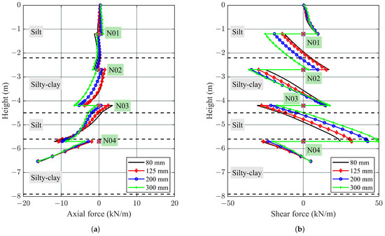 To study the effect of facing thickness on the behavior of the nailed structure, various thicknesses of facing were considered here, i.e., 80, 125, 200 and 300 mm; no surcharge loading was applied in this case. The results for the effect of facing thickness on facing axial force, shear force, bending moment and retained soil displacement with depth are presented in Figure 3. Figure 3a shows the profile of the facing axial force with depth; in general, the axial force remains reasonably unaffected by the facing thickness except in the silty-clay layer between the depths of −2.70 m and −5.20 m, which revealed that the axial force increased slightly with the increase of facing thickness. The axial force was zero at the top of the facing, while the maximum axial force was observed at the bottom of the facing. The increase of axial force with depth was most likely due to the transfer of the normal stress of the nail to the structural facing element [16].
