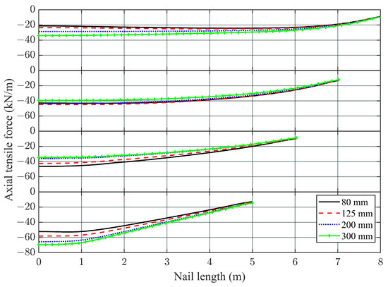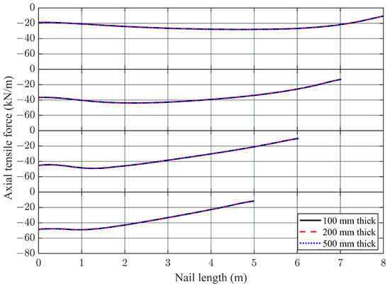The distribution of nail axial (tensile) forces was also recorded during the numerical analysis. A typical distribution of nail axial force without any surcharge loading acting on the ground surface is presented in Figure 4. In general, the value of the axial force increased with the increase in facing thickness except for nail row three (N03). This could be due to the variation of axial forces generated in the facings, as shown in Figure 3a, in which the facing axial force is higher in the case of 80 mm thick facing than that of the 300 mm thick facing as a result of the “pull-back” effect by nail N03. It was also observed that for a particular thickness, the value of the tensile force in the nail installed in the top row (Nail row–1) was smaller than that in the nail installed in the lowest row (Nail row–4). Viswanadham and Rotte [22], who performed centrifuge simulation, also found that in the case of stiff facing, the nail tensile force increased from the upper row to the lower row nails. The observation is in agreement with the finding of Dai et al. [19] in which they claimed that an increase in the nail embedment depth rendered an increase in the maximum axial force in the nail; thus, the lowest row of nails has the maximum tensile axial force.
