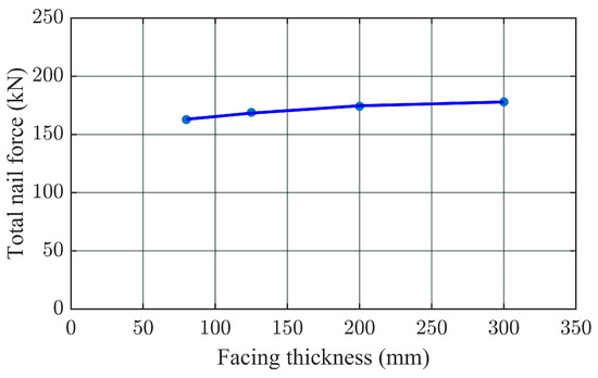 Figure 5 shows the total nail tensile force recorded at the joint between the facing and the nails for all thicknesses of facing. The result from this study showed that the total nail tensile force on the facing increased slightly with the increase of facing thickness. As the facing thickness increased from 80 mm to 300 mm, the total nail force only increased by about 15 kN.
