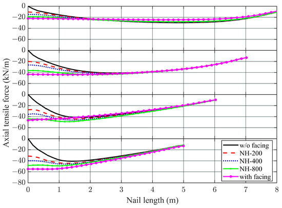 Distribution of nail axial force with various facing thicknesses.