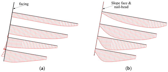 Distribution of nails axial force with excavated face covers by: (a) full-face facing; (b) nail head.