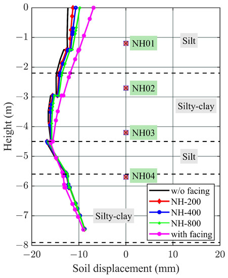 Figure 6b,c show the distribution of shear force and bending moment, respectively, of the facing with depth under the considered surcharge loadings. In this case, the shear force and bending moment of the facing remained reasonably unchanged or increased minutely with the increase of surcharge loading when it was subjected to a surcharge loading of between 0 and 30 kPa. Nevertheless, the results show that the maximum shear force and bending moment occurred at the elevation of the nail in the lowest row (Nail row–4). As such, the joint between the nail and the facing should be designed carefully to avoid facing connection failure. The soil horizontal displacement profile, which was recorded one meter behind the facing, is plotted in Figure 6d. The result shows that with the higher value of surcharge load, the retained soil displacement also increases. The maximum displacement was observed at the interface between the second layer silty clay and the third layer silt at EL −4.5 m, about 70% of excavated depth, when a 30 kPa surcharge load was acting full width on the ground surface. The results in this study were found to be similar to the work conducted by Ghareh [16].