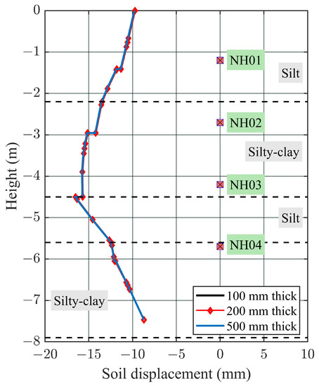 Retained soil displacement profiles under nail heads with various thicknesses.