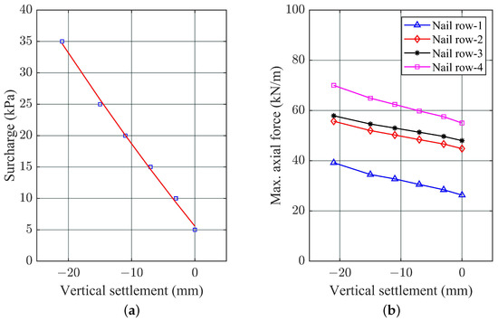 Relation between: (a) surcharge; (b) maximum nail tensile force, with ground surface vertical settlement.
