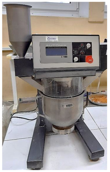The cement mixtures were produced using an automatic programmable mixer CONTROLS 65-L0006/AM with planetary rotation of the working body (Figure 1) in two speed modes: slow speed—blade rotation 140 ± 5 rpm, fast speed—blade rotation 285 ± 10 rpm. The sequence of the mixing operations are shown in Table 4. The components were mixed in a plastic drum with rubber balls. The mixing procedure was performed as follows. The sand was poured into the metering device of the mixer. Water was poured into the mixer bowl previously wiped with a damp cloth, and then the pre-mixed cement was added. Following this, the mixer was turned on at low speed and mixed the components. Following this stage of mixing, sand was added and the mixing continued at low speed, after which the cement mortar was additionally mixed.