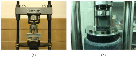At day 28, the samples were tested on bending and compression in accordance with GOST 30744. The bending test was carried out using a PM-A-70AB press (Figure 2a). The bending strength Rstr was calculated by Formula (1):
