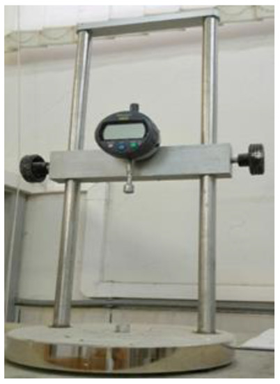 Deformation of the hardened cement mortars was evaluated by testing the 40 × 40 × 160 mm beam specimens. One day after molding, a brass adhesive rod was glued to the center of each end face of the beam sample. A quickly polymerizing non-expanding glue (epoxy resin 80 g, polyethylene polyamine 3 g, dibutyl phthalate 1 g) was used to fasten the adhesive. Prior to testing, an indicator-type device (Figure 3) was adjusted to the samples to measure the strain. Once the length of the samples was measured, they were stored in water. To determine the deformative properties, three beam samples of each composition were made.