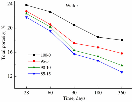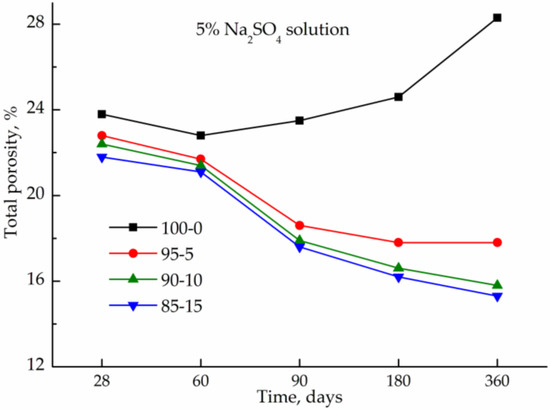 Total porosity of the mixed cement specimens hardened in 5% Na2SO4 solution.