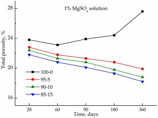 Total porosity of the mixed cement specimens hardened in 1% MgSO4 solution.