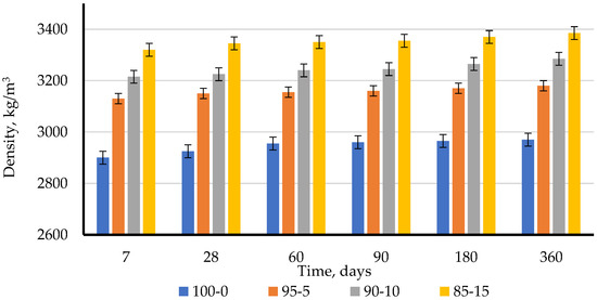 Optimizing the structure of the hardened cement paste by replacing a part of the Portland cement leads to an increase in the density of the samples. The values of the density of the samples of different composition are shown in Figure 8. As can be seen from the presented results, the higher the AFCS additive content, the lower the porosity of the samples, and the higher the density. Such a density structure with reduced porosity is observed in samples with higher strength and with lower water absorption. The strength of the mixed cement samples cured under normal conditions is presented in Table 5.