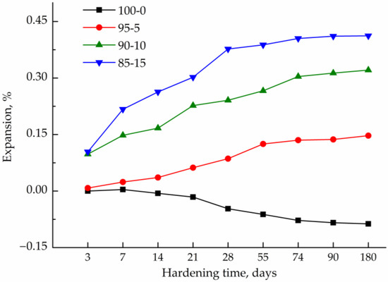 The results of the determination of the mixed cement samples expansion (shrinkage) are shown in Figure 9. As can be seen from the data obtained, the Portland cement samples undergo shrinkage. The mixed cement samples show no shrinkage, but expansion occurs during the first 14 days of hardening. Such an effect can be explained by the formation of a crystalline structure in the hardening cement paste. When the crystallization is completed, the caged structure fills in with fine crystals of calcium hydrosilicates. During this period, the expansion process is stabilized, and the strength (density) of the samples increases.