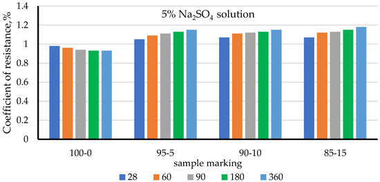 The coefficients of corrosion resistance of the mixed cement samples during different periods (days) of hardening in 5% Na2SO4 solution.