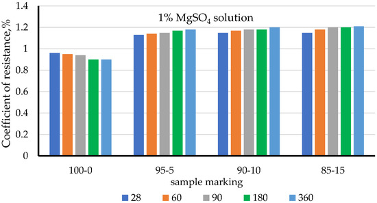 The coefficients of corrosion resistance of the mixed cement samples during different periods (days) of hardening in 1% MgSO4 solution.