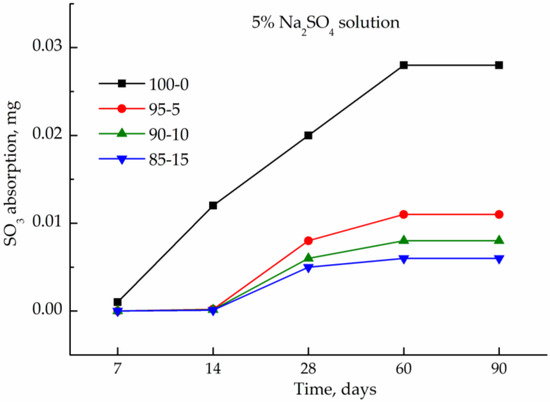 The results of absorption measurements (Figure 12 and Figure 13) show that the hardened cement paste does not absorb sulphate ions from the solutions during the first 14 days, in contrast to Portland cement. A slightly increased absorption of sulphate ions by the mixed cements is observed only by day 28 of hardening, and further substantial penetration of sulphate ions into the cement stone does not occur. Such a resistance to the sulphate attack can be explained by establishing a saturation equilibrium between the corrosive medium and the cement stone.