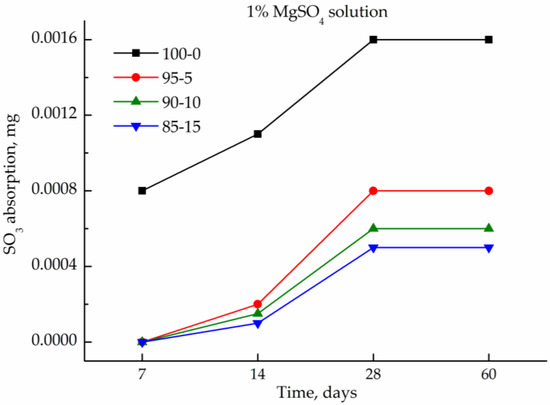 Kinetics of the sulphate ions absorption by the mixed cement samples from 1% MgSO4 solution.