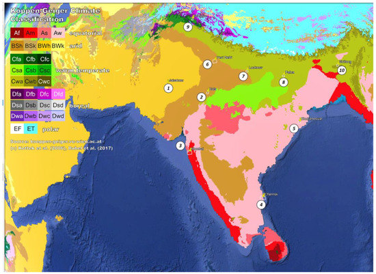 - Kottek, M.; Grieser, J.; Beck, C.; Rudolf, B.; Rubel, F. World Map of the Köppen-Geiger Climate Classification Updated. Meteorol. Z. 2006, 15, 259–263. [Google Scholar] [CrossRef]