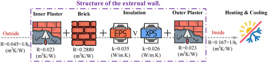 The optimal insulation thickness was found in this investigation by considering that heat losses only occurred through outer walls. The wall model, as shown in Figure 2, was composed of interior plaster, insulating material, concrete, and exterior plaster. Table 2 displays the properties of these wall components [27,28].