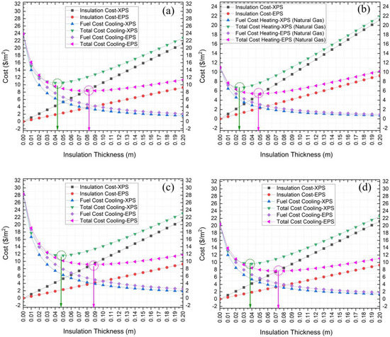 Cost–insulation thickness relationship for EPS and XPS insulation materials: (a) Mumbai, (b) Srinigar, (c) Chennai, and (d) Patna.
