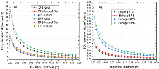 Fuel gas emission–insulation thickness: (a) CO2 (Shillong) (b) SO2-Coal (Shillong and Srinagar).