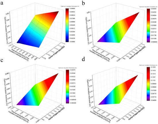 Optimal insulation thickness and k-NDD values: (a) electricity; (b) natural gas; (c) coal; (d) diesel.