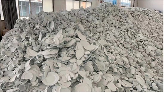 China is the largest ceramic producer and consumer in the world, and its output of traditional ceramics has ranked first in the world for more than 10 consecutive years. In 2021, the output of building ceramics was approximately 8.174 billion square meters, and the output of sanitary ceramics and daily ceramics reached approximately 220 million and 60 billion square meters, respectively. The rapid development of the traditional ceramic industry has made a significant contribution to China’s economic construction [1]. However, the massive ceramic output is also accompanied by substantial ceramic wastes. At present, the annual amount of solid waste generated from traditional ceramic production in China has reached nearly 20 million tons [1]. A large amount of sintered ceramic wastes are mainly discarded at landfill sites, occupying a large amount of land and causing severe environmental pollution [2], which has become a prominent problem to plague the ecological development of ceramic production areas.