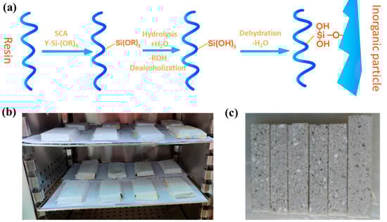 The specific preparation process of the sample was as follows. (1) According to the aggregate particle grading scheme shown in Table 1 and Table 2, the crushed and graded ceramic waste was mixed with the quartz sand particles for 30 min. Then, the coupling agent aqueous solution and resin solution was added and continued to stir for 5 min for granulation (the amount of coupling agent was 1 wt% of the amount of resin). After this step, the appropriate amount of curing agent and curing accelerator were added (the content of the resin was 0.5 wt%) and fully stirred for 5 min. The mixture was poured into the forming mold to distribute evenly. (2) High-frequency vibration compaction molding was performed by applying vacuum vibrating press. The vacuum degree was −0.1 MPa, molding pressure was 10 MPa, and pressure holding time was 5 min. (3) The samples were fully cured by holding at 90 °C for 2 h after pressing and molding. After being cured and molded, the samples were demolded and allowed to naturally cool to room temperature. The dimension of obtained samples was 140 mm × 75 mm × 20 mm. The performance tests were conducted after cutting and multi-stage polishing. Figure 2 shows the schematic diagram of the curing process for ceramic particles combined with resin and the ceramic waste artificial stone samples obtained after thermocuring, polishing, and cutting.